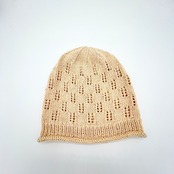 本体部分は、控えめな市松柄の透かし編みが入っています。伸縮性のある編み方なので、頭を締め付けません。